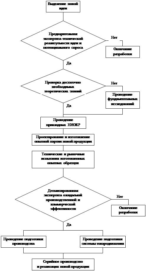 Совокупность формирующих инновационный процесс стадий может различаться в зависимости от типа осуществляемых предприятием инноваций. Наиболее развернуто такие стадии реализуются при осуществлении продуктовых нововведений, т.е. при освоении в производстве и выведении на рынок новых видов продукции. Инновационный процесс в этом случае может включать в себя следующие базовые этапы: