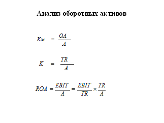 1. анализ оборотных активов предприятия в предшествующем периоде. Коэффициент маневренности (Км); коэффициент оборачиваемости (К) – зависит от отрасли, интересен в динамике, чем выше выручка и ниже активы, тем выше скорость оборота и ниже риск инвестора (кредитора); модель Дюпонт - доказывает возможность прироста ROA при неизменной рентабельности продаж за счет ускорения оборачиваемости активов. Также осуществляется структурный динамический анализ оборотных активов; структура источников финансирования оборотных активов (величина ЧОК, СОК и определяемый этими величинами уровень риска). Отдельно для оборотных активов рассчитывается DFL.