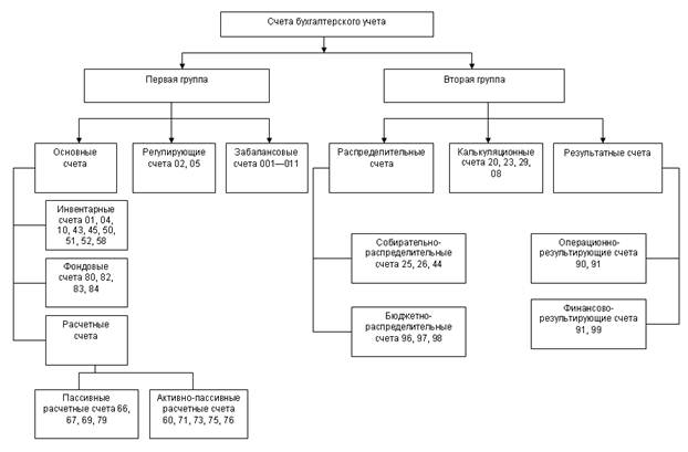 Первая группа счетов предназначена для учета хозяйственных средств, счета этой группы подразделяются на основные, регулирующие и забалансовые счета. В свою очередь основные счета подразделяются на инвентарные, фондовые и расчетные счета.
