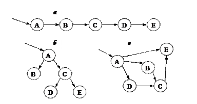 Структурой данных (data structure) называют совокупность (множество) данных и отношений между ними. Один и тот же набор данных можно представить по-разному. Пусть имеется пять данных типа Char: ¢А¢, ¢B¢, ¢С¢, ¢D¢ и ¢Е¢. Из этой совокупности значений можно сформировать как линейную последовательность элементов, так и дерево или сеть, как показано на рисунке 1.3.