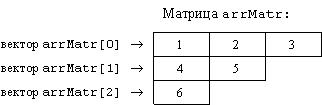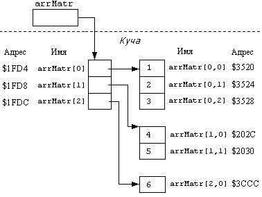 Физическая структура массива приводится на рисунке 5.3. Как показывает этот рисунок, для всего массива в сегменте статических данных для массива выделяется 4-хбайтовая ячейка, в которую помещается указатель (адрес) на вектор (arrMatr[0], arrMatr[1], arrMatr[2]), элементы которого располагаются в куче, занимая последовательные 4-хбайтовые ячейки. В этих ячейках содержатся ссылки на слоты соответствующих строк, а сами слоты размещаются в куче в непредсказуемом «порядке». Элементы каждой строки располагаются в слотах строки последовательно друг за другом. В ячейки элементов заносятся из значения.
