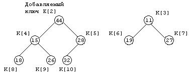 Теперь рассмотрим процесс создания пирамиды из массива a[0], a[1], …, a[HighIndex]. Напомним, что элементы этого массива индексируются от 0, а пирамида от 1 и, кроме того, N = HighIndex+1. Ясно, что элементы a[N/2], a[N/2+1], …, a[HighIndex] уже образуют пирамиду, поскольку не существует двух индексов i (i= N/2+1, N/2+2,…) и j, таких, что, j=2i (или j=2i+1). Эти элементы составляют последовательность, которую можно рассматривать как листья соответствующего двоичного дерева. Теперь пирамида расширяется влево: на каждом шаге добавляется новый элемент и при помощи просеивания помещается на соответствующее место. Этот процесс иллюстрируется следующим примером.