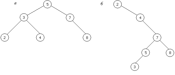 На рисунке 13.1 показаны два бинарных дерева поиска. Дерево на рисунке 13.1 б менее эффективно для поиска, поскольку его высота равна 4, в отличие от дерева на рисунке 13.1 а, высота которого равна 2.