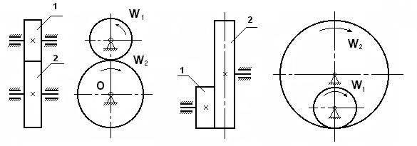 | Рис. 7. Пара зубчатых колес с внешним зацеплением: 1, 2 – зубчатые колеса | Рис. 8. Пара зубчатых колес с внутренним зацеплением: 1, 2 – зубчатые колеса |