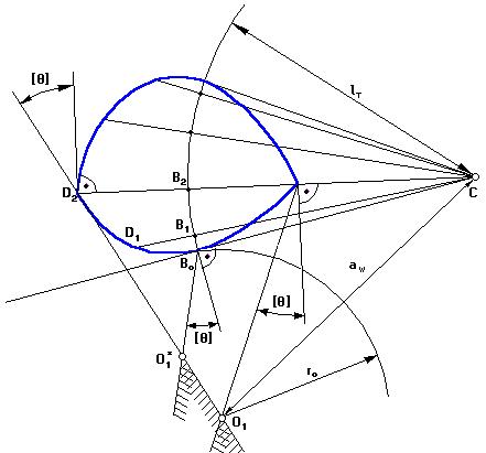 Если учитывать реверс, то второй луч проводят под углом [θ] через отрезок кинематических отношений, отложенный под углом в 90º по направлению реверса и имеющий максимальное значение. Центр кулачка будет в т.О1*: