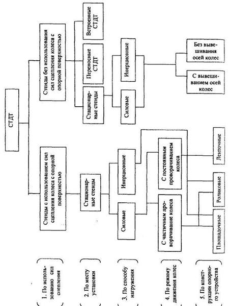 Все СТДТ подразделяются на две большие группы. Первая, наиболее многочисленная, работает с использованием сил сцепления колеса с опорной поверхностью. В данных стендах реализуемый тормозной момент ограничен силой сцепления колеса с опорной поверхностью стенда, поэтому в большинстве из них невозможно реализовать полный тормозной момент автомобиля. Вторая группа стендов, работающих без использования сил сцепления колеса с опорной поверхностью, конструктивно отличается тем, что тормозной момент передается непосредственно через колесо или через ступицу. Эта группа стендов не нашла широкого применения из-за сложности конструкции и нетехнологичности проведения испытаний (т.е. необходимости присоединять колесо или ступицу к приводу).