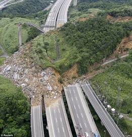 Экскаваторы копаются в грязи массовых оползней в поисках пропавших без вести людей на дороге за пределами северо-восточного порта Keelung, Тайвань. (AP Photo/National Airborne Service Corps)