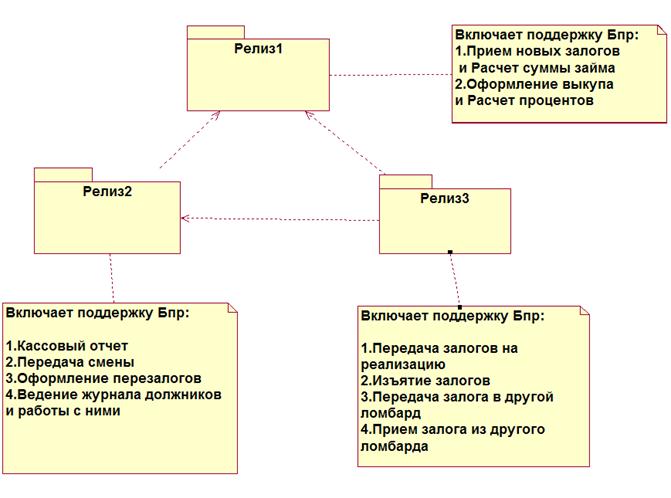 Используя информацию о важности для бизнеса информационной поддержки отдельных Бпр (таблица 2.2.), а также о частоте применения отдельных Бпр (таблица 2.3.) реализацию проекта разделим на три этапа, каждый из которых завершается версией (релизом) ИС «Ломбард», включающей всю функциональность более ранних релизов.
