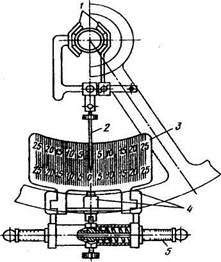 1, 4-захваты; 2-стрелка; 3 - шкала измерения люфта; 5-шкала измерения усилия поворота рулевого колеса (динамометра)