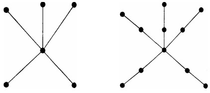 Рис. 8. Звездная структура: а – с коротким (одинарным) лучом; б – с удлиненным (двойным, тройным) лучом «колесо» (рис. 9а). Замкнутая централизованная конфигурация. Представляет синтез кольцевой и звездной конфигураций. Помимо централизованных имеет еще и развитые периферийные связи. Структуры данной конфигурации относятся к довольно распространенным. Такой может быть, например,