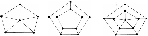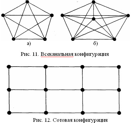 Рис. 10. Веерная конфигурация всеканальная. Замкнутая конфигурация, при которой каждый из элементов системы связан со всеми остальными элементами. Может быть сформирована на основе простого многоканального, сужающего или расширяющего соединений. Основные разновидности: децентрализованная и централизованная. Децентрализованная аналогична кольцевой, но при полном развертывании связей по типу «все со всеми» (рис. 11а). Характерна для групп неформального общения, творческих и иных групп, не имеющих выраженных лидеров. Централизованная аналогична конфигурации «колесо» также с полным развертыванием периферийных связей (рис. 11б). Например, производственные бригады с полной взаимозаменяемостью работников или исследовательские группы, не имеющие ярко выраженной специализации исполнителей по видам работ, при условии, что в этих коллективах имеются ярко выраженные руководители-координаторы; сотовая (рис. 12). Децентрализованная конфигурация с высокой степенью регламентированности связей сформирована на основе разных типов соединений. В завершенном виде является замкнутой. Например, структура системы формирования, хранения и использования конфиденциальной информации;