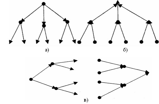 Рис. 9. Конфигурации «колесо» и «кольцо» а – конфигурация «колесо»; б – «двойное колесо»; в – «колесо с двойным ободом» веерная. Разомкнутая централизованная конфигурация. Сформирована на основе конвергентных и дивергентных соединений. В зависимости от пространственной ориентации может быть вертикальной или горизонтальной, а в зависимости от типа базового соединения – расходящейся или сходящейся. Примером вертикального расходящегося веера является традиционная система линейного управления (рис. 10а), сходящегося – система обратной связи и информационного обеспечения руководства (рис. 10б). Примером горизонтального расходящегося (сходящегося) веера является технологическая