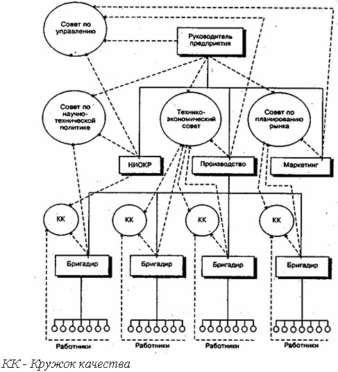 Рис. 27. Принципиальная схема структуры многомерной организации Партисипативные организации (рис. 28) – это организации, где посредством создания органов самоуправления осуществляется некомпетентное вмешательство в работу других членов или частей организации, т.е. участие работников в управлении. Тем самым обеспечивается мотивированность их труда, обостряется чувство собственника. Рис. 28. Принципиальная схема структуры партисипативной организации В таких организациях работники могут: участвовать в принятии решений; участвовать в процессе постановки целей; участвовать в решении проблем организации. Им дано право: выдвигать предложения; вырабатывать альтернативы решений проблем; выбирать окончательное решение. В традиционных организациях руководитель принимает решения, а работник их выполняет. В организациях с делегированием прав подчиненный самостоятельно принимает решения в рамках своих полномочий (по системе «елочка» или «матрешка»). В партисипативных организациях решение принимается с учетом мнения (вклада) руководителя и вклада работников. Примеры форм взаимодействия руководства и работников: советы по научно-технической политике (например, состав: руководитель подразделения, руководитель НИОКР, бригадиры участков); технико-экономические советы (например, состав: руководители подразделений, начальники цехов, руководители кружков качества, бригадиры рабочих участков); советы по планированию сбыта (например, состав: руководители подразделений, начальники отделов маркетинга и сбыта, представители кружков качества); кружки качества (бригадиры, работники, представители технико-экономического совета); целевые, антикризисные комитеты, комитеты по набору кадров; конфликтные комиссии (высшее руководство, руководство среднего звена, независимые эксперты, представители кружков качества и работники). Решения советов, комитетов, кружков качества, конфликтных комиссий, как правило, являются обязательными для руководителей, при которых они создаются. Одновременно они несут ответственность за принимаемые решения. Очень важно обеспечить баланс власти между советами, комитетами, комиссиями и руководителями, при которых они создаются. Партисипативные структуры распространяются на часть или отдельные уровни управления организацией. В последнее время широко обсуждается вопрос о появлении нового вида продукции, получившей название виртуальной. Эта продукция (или услуга) может создаваться благодаря последним достижениям в области обработки информации, организационной динамики и развития производственных систем. Выпуск такой продукции становится доступным в любое время, в любом месте и в бесчисленном количестве вариантов моделей и форматов. Идеальный виртуальный продукт — это то, что производится моментально и адресно по требованию заказчика. Общей чертой этой продукции является то, что она оплачивается потребителем мгновенно. Его концепция, дизайн и изготовление сохраняется в умах группы работников, программах компьютеров и гибких производственных линий. Другая отличительная особенность виртуальной продукции — возрастание роли потребителя как сопроизводителя продукции — может быть прослежена на примерах многих отраслей. В каждом случае заказчик может не только контролировать результаты, но в проц