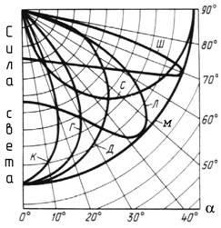 | Рис.2.5. Типы стандартизованных КСС: К – концентрированная; Г – глубокая; Д – косинусная; Л – полуширокая; Ш – широкая; М – равномерная; С – синусная. |