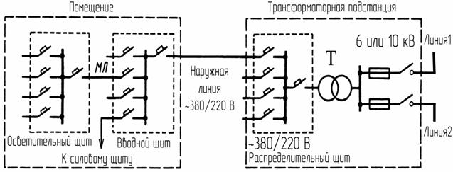 Ввод в помещение осуществляется наружной магистральной линией напряжением ~ 380/220 В, которая может быть воздушной или кабельной.