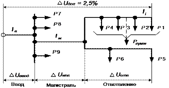 Для этого, исходя из реальной длины участка и значения нагрузки на данном участке сети, следует задаться расчётными значениями потерь напряжения на этих участках D Uввод и D Uмаг таким образом, чтобы суммарная потеря напряжения (D Uввод + D Uмаг + D Uотв) не превышала допустимого значения для внутренней проводки, равного D Uдоп = 2,5 % от Uн.