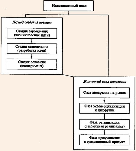 Для того чтобы учесть совокупность всех этапов деятельности в период от поиска новых идей до их использования, коммерциализации и распространения, следует ввести понятие "инновационный цикл".