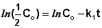 Еще одной кинетической характеристикой реакции является период полупревращения t1/2 – время, за которое концентрация исходного вещества уменьшается вдвое по сравнению с исходной. Выразим t1/2 для реакции первого порядка, учитывая, что С = ½Со: