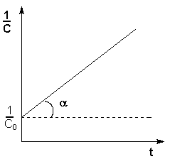 Т.о., для реакций второго порядка, имеющих кинетическое уравнение вида (II.14), характерна линейная зависимость обратной концентрации от времени (рис. 2.4) и константа скорости равна тангенсу угла наклона прямой к оси времени: