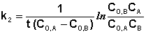 Если начальные концентрации реагирующих веществ Cо,А и Cо,В различны, то константу скорости реакции находят интегрированием уравнения (II.21), в котором CА и CВ – концентрации реагирующих веществ в момент времени t от начала реакции: