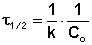 Метод определения времени полупревращения заключается в определении t1/2 для нескольких начальных концентраций. Как видно из приведённых в таблице уравнений, для реакции первого порядка время полупревращения не зависит от Co, для реакции второго порядка – обратно пропорционально Co, и для реакции третьего порядка – обратно пропорционально квадрату начальной концентрации.