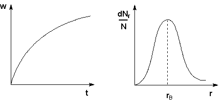 Методы седиментации и ультрацентрифугирования применяются для изучения полидисперсности коллоидных систем, обусловленной существованием в коллоидных системах частиц различных размеров. Изучение полидисперсности коллоидных систем для установления количественного распределения частиц по размерам (т.н. кривых распределения) – седиментационный анализ – производится при помощи измерения возрастания веса осевших частиц w со временем. По результатам такого исследования строят кривые седиментации (рис. 4.15). Проводя анализ кривой седиментации, можно рассчитать кривую распределения для данной системы, которая характеризует относительное содержание в системе частиц разного размера (рис. 4.16). Обычно кривые распределения содержат один максимум, который соответствует rв – наиболее вероятному радиусу частиц дисперсной фазы.