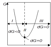 На рис 2.1 показано изменение энергии Гиббса для самопроизвольных процессов (I), в условиях равновесия (II) и для несамопроизвольных процессов (III) Когда dG < 0, то процесс будет самопроизвольным, а при dG = 0 — равновесным.