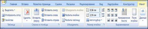 Редактирование ячеек таблицы выполняют с помощью панели инструментов Макет.