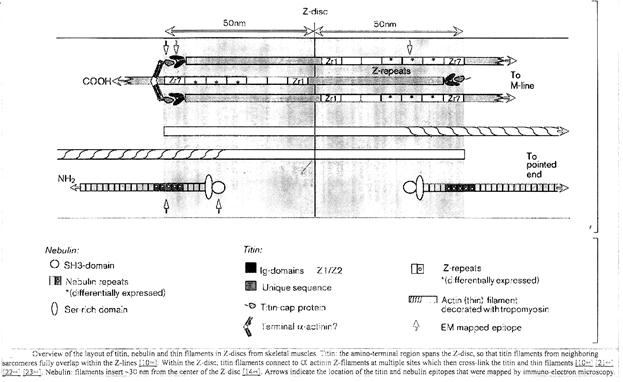 Состав: α – актинин – 97 KD. Расположен в антипараллельном направлении, образуя плотные связи с фибриллярным актином, закрепляя его в Z- диске.