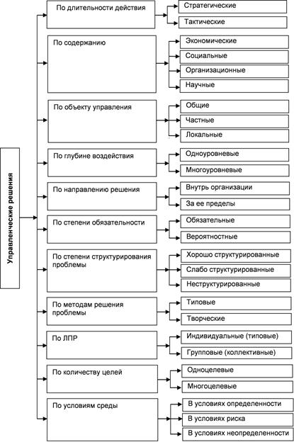 Управленческое решение классифицируют по различным признакам. Наиболее общими из них являются длительность действия, содержание, объект управления, глубина воздействия, направление решения, степень обязательности выполнения, степень структурирования проблемы, методы ее решения, лицо, принимающее решения, количество целей и условия среды. На основе классификации управленческих решений осуществляется оценка их отдельных разновидностей и упорядочивание