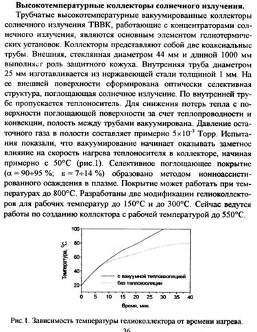Такие коллекторы используют в системах теплоснабжения, отопления и опреснения. В зависимости от вида теплоносителя применяют жидкостные или воздушные коллекторы. Наиболее распространена конструкция типа "горячий ящик", основным элементом к-рой является тепл-оприемник. Удвоение размеров коллектора не всегда приводит к двукратному увеличению кол-ва полезно поглощенной теплоты. Кол-во энергии, полученное поверхностью, будет наибольшим, если она обращена строго на юг. Практически коллекторы устанавливают с отклонением 15—20° от оптим. ориентации, и это незначит. уменьшает его произ-сть. Для круглогодич. макс, облученности угол, равный широте местности, является оптимальным. При использовании коллектора преимущественно летом макс. плотность радиации будет при угле наклона, равном широте местности, минус 15°, а зимой — при угле наклона на 15° больше широты местности.
