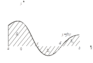 и меняет знак в конечном числе точек, то площадь заштрихованной фигуры (Рис. 4) равна алгебраической сумме соответствующих определенных интегралов: