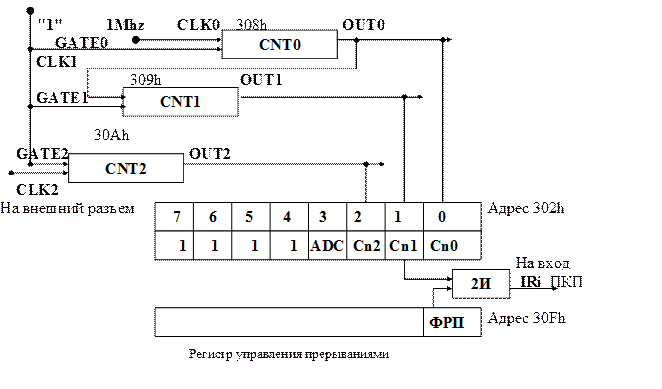 На управляющие входы всех каналов GATE подан разрешающий потенциал GATE 0= GATE 1= GATE 2=1. На вход CLK 0-го канала подсоединен генератор FCLK 0=1 МГц. Выход OUT 0-го канала соединен с входом CLK 1-го канала, что позволяет работать с временными интервалами: TOUT =4 мкс÷65536 мкс. Выход OUT 1-го канала соединен с IRi ПКП через схему формирования ЗП.