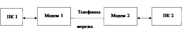Цифрові дані, що надходять у модем з комп'ютера, перетворюються в ньому шляхом модуляції відповідно до обраного стандарту (протоколом) і направляються в телефонну лінію. Модем-приймач, що розуміє даний протокол, здійснює зворотне перетворення (демодуляцію) і пересилає відновлені цифрові дані у свій комп'ютер. У такий спосіб забезпечується зв'язок між комп'ютерами й обмін даними між ними. Зв'язок між ПК з використанням телефонної мережі, показано на рис. 1.10.