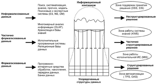 У цей час існують певні категорії інформаційних систем (або відповідні модулі інтегрованих ИС), які обслуговують кожний організаційний рівень і допомагають успішно вирішувати зазначені вище класи завдань із обробкою відповідного типу даних (мал. 1.6 і 1.7).