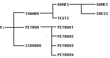 Хай в якійсь організації (офісі фірми, конструкторському бюро і тому подібне) три співробітники по прізвищах Іванов, Петров і Сидоров використовують для роботи один комп'ютер і, щоб упорядкувати інформацію з якою працює кожен з них, на диску З: виділено три каталоги IVANOV, PETROV і SIDOROV (див. малюнок). Припустимо, що Іванов використовує комп'ютер в двох целях- готує ділові (або якісь інші) документи і грає (звичайно, у вільний час) в комп'ютерні ігри. Тому він виділив в своєму каталозі IVANOV два підкаталоги TEXTS (для текстів) і GAMES (для ігор). У каталозі GAMES, у свою чергу, виділені два інших подкаталога- CHESS (для шахів) і GAMES (для решти ігор). Петров виділив в своєму каталозі чотири підкаталоги, а Сидоров вирішив підкаталогів не створювати (напевно він не часто користується комп'ютером).