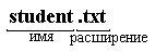 ІМ'Я ФАЙЛУ СКЛАДАЄТЬСЯ З ВЛАСНЕ ІМЕНІ, що МІСТИТЬ ОТ 1 ДО 8 СИМВОЛІВ, І НЕОБОВ'ЯЗКОВОГО РОЗШИРЕННЯ, що СКЛАДАЄТЬСЯ З КРАПКИ І НАСТУПНИХ ЗА НЕЮ ОДНОГО, ДВА АБО ТРЬОХ СИМВОЛІВ. ІМ'Я ФАЙЛУ ПРИЙНЯТО ЗАПИСУВАТИ МАЛЕНЬКИМИ ЛАТИНСЬКИМИ БУКВАМИ: student.txt, document.txt, program.c, game1.exe, readme.