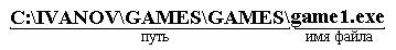 Звернете увагу, що файли autoexec.bat, config.sys, cyr.exe на схемі знаходяться в кореневому каталозі C:, файли ivan.hlp, john.txt - в каталозі IVANOV. Як і у випадку з каталогами, на диску можуть бути файли з однаковими іменами, але тоді вони повинні знаходитися в різних каталогах (файли game1.exe на схемі).