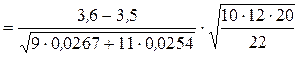 которая имеет распределение Стьюдента с k = nx + ny -2 = 10 + 12 -