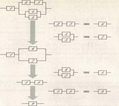 Сначала выделим две подсистемы: последовательную из элементов 2 и 3 и параллельную из элементов 4 и 5, преобразовав эти фрагменты в соответствующие эквивалентные элементы 6 и 7. Затем элементы 6 и 7 преобразовываются в эквивалентный элемент 8. Наконец, вся система сводится к последнему эквивалентному элементу 9.