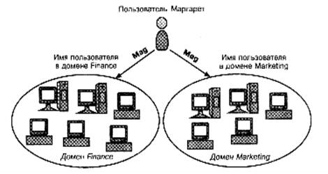 Когда Маргарет регистрируется в домене Marketing, она получает доступ к его ресурсам, как установлено администратором, но у нее нет при этом доступа к домену Finance. Аналогично при входе в домен Finance у нее нет доступа к домену Marketing. Чтобы снова добраться до ресурсов домена Marketing, Маргарет должна выйти из домена Finance и войти в домен Marketing, т. е. при такой организации невозможен одновременный доступ к ресурсам нескольких доменов. Все входы и выходы малоэффективны.