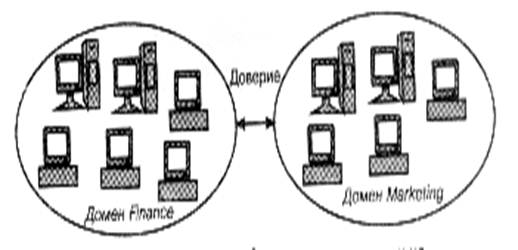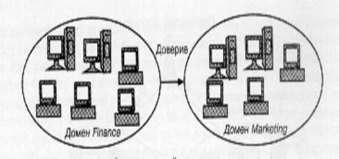 Конечно же, может существовать несколько доменов, между которыми не установлены доверительные отношения(недоверительные отношения между доменами). Например, у пользователя могут быть учетные записи в каждом домене многодоменной сети. На рис. 3 показана сеть с двумя доменами; один домен называется Marketing, а другой Finance.