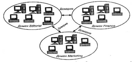 На рис. 6 показана сеть из трех доменов. Домен Marketing доверяет домену Finance, и наоборот. Третий домен, Editorial, имеет двусторонние доверительные отношения с доменом Finance. Однако домены Editorial и Marketing не будут доверять друг другу, пока между ними не будут установлены доверительные отношения. Доверие домена Editorial домену Finance не распространяется дальше на домен Marketing. Точно так же двусторонние доверительные отношения между доменами Marketing и Finance не выходят за пределы домена Finance и не включают в себя домен Editorial.