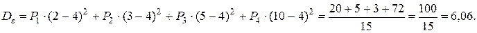 В задачах выборочная совокупность может быть задана таблицей распределения с относительной частотой. В данном примере в таблице 13 последняя строка переписывается через относительную частоту pi=ni/n. В примере n =15. Выборочная дисперсия D вычисляется по данным таблицы 14.
