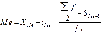 - нижняя граница медианного интервала (интервала для которого накопленная частота впервые превысит полусумму частот)