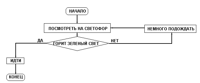 ГРАФИЧЕСКАЯ ИНТЕРПРЕТАЦИЯ АЛГОРИТМА НАЗЫВАЕТСЯ БЛОК-СХЕМОЙ. В качестве примера рассмотрим блок-схему простого и хорошо всем известного алгоритма перехода улицы через перекресток, оборудованный светофором.