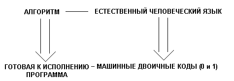 3. О ПРОГРАММЕ, ВЫПОЛНЯЮЩЕЙ ДЕЙСТВИЯ, ПРЕДПИСАННЫЕ АЛГОРИТМОМ, ГОВОРЯТ, ЧТО ОНА РЕАЛИЗУЕТ ДАННЫЙ АЛГОРИТМ НА ЭВМ. Следующим шагом после создания алгоритма является написание реализующей его программы. Основная сложность здесь заключается в том, что программа, как Вы помните, представляет собой набор двоичных кодов - нулей и единиц. Алгоритм же формулируется на естественном человеческом языке- русском, английском, немецком, арабском и.т.д. Понятно, что перевести текст на естественном человеческом языке в набор цифр чрезвычайно сложно: