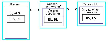 - средний уровень представляет собой сервер приложений, на котором выполняется прикладная логика BL и с которого логика обработки данных DL вызывает операции с базой данных DS;