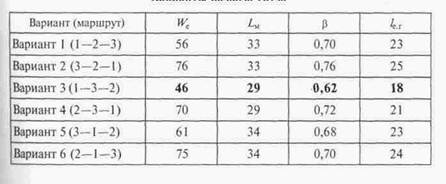 Количество возможных вариантов объезда пунктов доставки груза равно 3! = 1×2×3= 6. Показатели работы автомобиля при развозе груза по каждому из возможных вариантов приведены в таблице 6.1