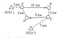 CD – 4 т. Время погрузки-разгрузки в одной ездке 0,5 ч; Тн = 10 ч; vT – 30 км/ч. Расстояния в километрах приведены на рис. 3.10. Определить производительность в тоннах при работе автомобилей на маятниковых маршрутах и при объединении их в один кольцевой ABCD. Сравнить β (коэффициент использования пробега) в обоих случаях.